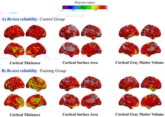 Pre-post Pearson correlations at the vertex level (A) in the control group and (B) in the training group, for the three surface-based morphometry (SBM) indices: thickness, surface area, and volume.