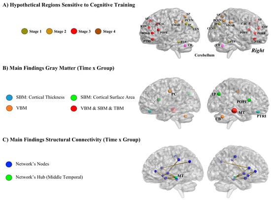 Figure 6 depicts (a) the network of brain regions that should be sensitive to the completed training according to both theory and previous research (Figure 6A); (b) findings derived from VBM, TBM, and SBM analyses (Figure 6B); and (c) findings derived from structural connectivity (SC) analyses (Figure 6C).