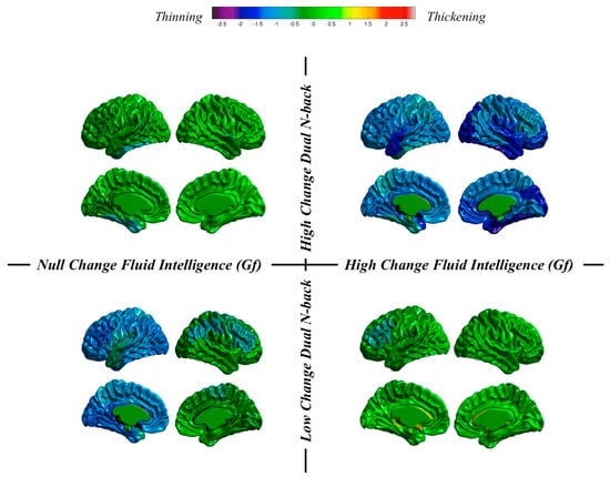 Regarding thickness (Figure 7), we can see (a) preservation for an individual showing high dual n-back changes and null changes in Gf, as well as for an individual showing low n-back changes and high changes in Gf; and (b) thinning for individuals showing low or high n-back changes and null or high changes in Gf.