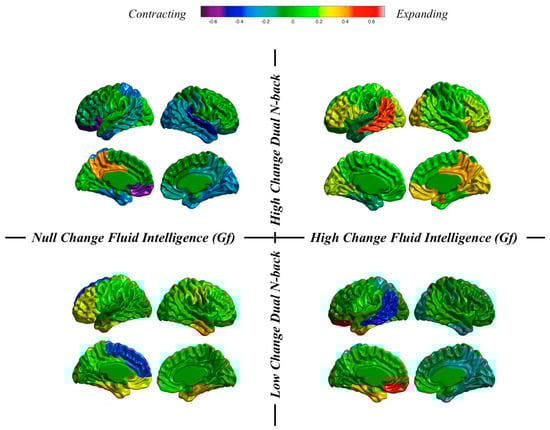 Surface area changes for individuals showing null changes in fluid ability and high changes in dual n-back (top left), high changes in fluid ability and high changes in dual n-back (top right), null changes in fluid ability and low changes in dual n-back (bottom left), and high changes in fluid ability and low changes in dual n-back (bottom right).