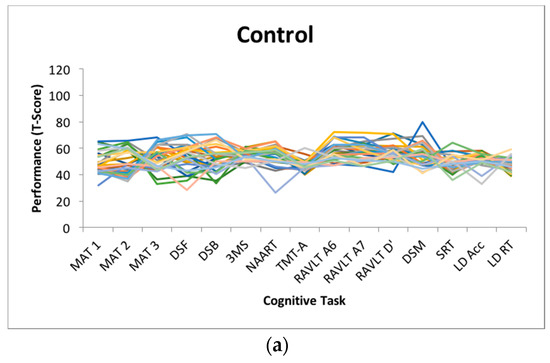 34] and that mean-level performance is likely to differ across age bands present in the current sample. The resulting residuals from these models were standardized as T-scores (M = 50, SD = 10), with ISDs subsequently computed across these residualized test scores. The resulting dispersion estimate, indexed on a common metric, reflects the amount of variability across an individual’s neuropsychological profile relative to the group average level of performance; higher values reflect greater IIV in cognitive function. Dispersion was computed across all test scores in the battery that were not used for cognitive classification (