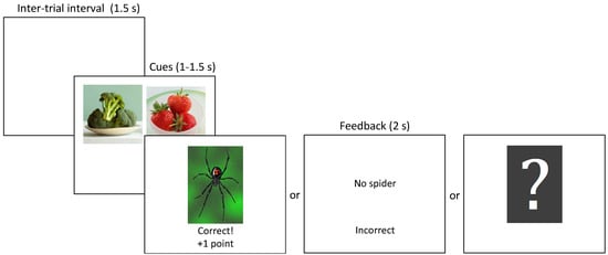 Trial procedure. After a 1.5-s inter-trial interval one or two food cues appeared for a fixed duration of 1 s (Experiments 1 and 2) or 1.5 s (Experiment 3). During this time participants were required to press ‘a’ or ‘l’ on the keyboard to indicate whether they thought the spider picture would follow or not. Regardless of whether they made a response, a feedback screen was shown for 2 s. On trials with feedback, the feedback screen consisted of either the picture of the spider or the words ‘No spider,’ along with the words ‘Correct! +1 point’ or ‘Incorrect.’ On trials without feedback a question mark was presented instead. On all trial types, if no response was made during cue presentation, the words ‘Press A or L faster!’ were displayed.