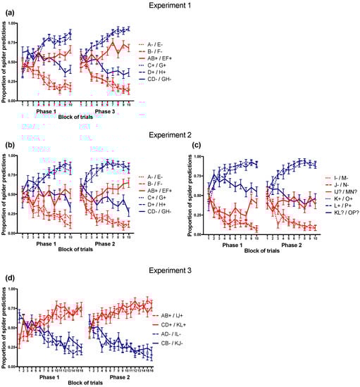 Average trial-by-trial predictions in the learning tasks. Spider predictions were coded as 1 and no-spider predictions were coded as 0. Error bars represent the standard error of the mean. The left panels show the performance on trials from the training sets in (a) Experiment 1, (b) Experiment 2 and (d) Experiment 3. The right panel (c) shows the performance on trials from the transfer set in Experiment 2.
