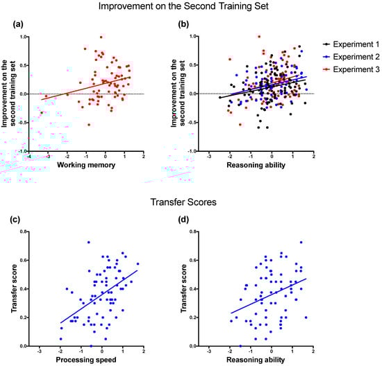 Scatter plots showing the correlations between learning measures and fluid abilities that were significant predictors after controlling for at least age and gender (Table 4). The upper panels illustrate the relationship between the improvement on the second training sets and (a) working memory in Experiment 3 and (b) reasoning ability in Experiment 1–3. The lower panels illustrate the relationship between the transfer scores in Experiment 2 and (c) processing speed and (d) reasoning ability.