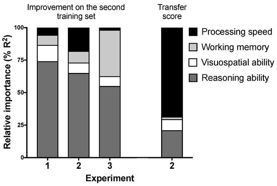 Relative importance metrics for the four fluid abilities obtained from relative importance regression models that included the four fluid abilities as predictors of either the improvement on the second training set (first three bars) or the transfer scores in Experiment 2 (fourth bar).