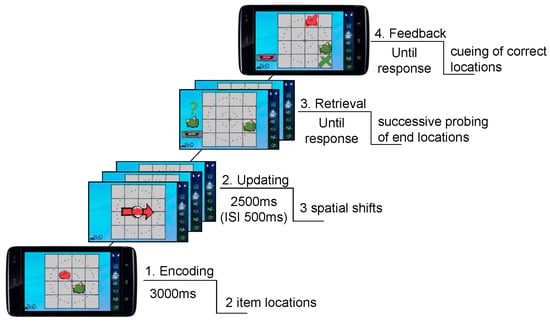 Moreover, whereas limits in attention reflect reasonable mechanisms of item-to-item variability in spatial precision (e.g., [,]), we cannot test these assumptions within the current study. Further work should focus on disentangling the mechanisms underlying variability of spatial precision and thereby limitations in children’s updating performance. Variability in spatial precision from item to item may result from early perceptual and attentional limitations during encoding but could also stem from constraints in memorizing, mentally shifting, and/or retrieving information in WM. Thus, future studies should examine the specific WM sub-processes and how their interaction affects variability in spatial precision. For example, to better understand updating-related processes, one could measure children’s estimates of remembered locations after each updating step by estimating spatial precision and its variability across updates. Further, technical advances in combining ambulatory assessment and neurocognitive methods such as mobile electroencephalography (EEG) (e.g., []) may reflect a fruitful approach to relate neural correlates of WM sub-processes to children’s behavioral performance in real-life contexts.