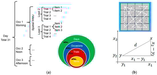 Behavioral data were analyzed using the lme4 package [] as well as core packages in R-statistics (https://www.r-project.org, R Core Team, 2016). Given the intensive longitudinal design, observations were inherently structured by repeated measures across items (Level 1) that were nested within trials (Level 2), measures across trials, in turn, were nested within occasions (Level 3) and assessment at occasions were nested within days (Level 4) (Figure 2a). Item responses were measured in terms of continuous spatial precision (i.e., Euclidean distance) in addition to discrete accuracy (i.e., correct vs. incorrect) (cf. Section 2.5). The hierarchical data structure allowed for decomposing the four different variance components of spatial precision for each individual (cf. Section 2.5).
