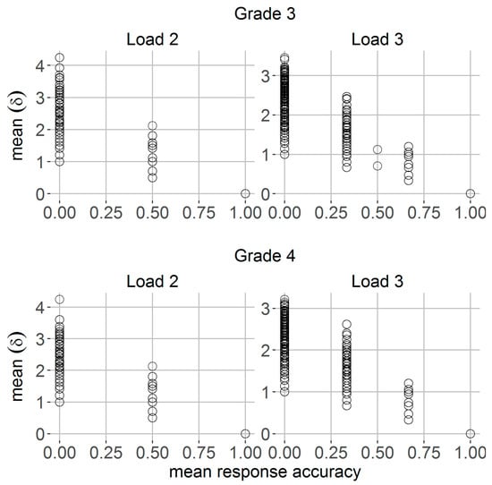 Trial-to-trial mean spatial precision (i.e., Euclidean distance δ) (y-axis) as a function of mean response accuracy (x-axis) for Grade 3 (first row) and Grade 4 students (second row) and separately for loads two and three.