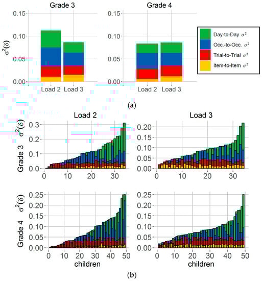 For the variability in spatial precision, the item-to-item variance component significantly increased with load in children from Grade 3 (Load 2: M = 0.011, SD = 0.007, Load 3: M = 0.014, SD = 0.005; t = −5.95, df = 33, p < 0.05) as well as in children from Grade 4 (Load 2: M = 0.005, SD = 0.004, Load 3: M = 0.012, SD = 0.004; t = −12.27, df = 48, p < 0.05) (cf. Figure 4a, yellow bars). No differences between load conditions were found for spatial precision variability from trial-to-trial (Grade 3: t = 1.58, df = 33, p = 0.12; Grade 4: t = −0.01, df = 48, p ≥ 0.99), occasion-to-occasion (Grade 3: t = 2.16, df = 33, p ≥ 0.04; Grade 4: t = 1.45, df = 48, p ≥ 0.15), or for true day-to-day variation in spatial precision (Grade 3: t = 1.49, df = 33, p ≥ 0.15; Grade 4: t = −0.33, df = 48, p ≥ 0.74) (see also Table S2, Online Supplement). These effects cannot be attributed to different trends of learning between the two load conditions, as we took into account individual longer-term trends separately for each child and load condition (cf. Materials and Methods, subsection Variance components of spatial precision). Thus, load-related differences in children’s updating performance can only be observed for the fast item-to-item changes in spatial precision performance within trials but not for the slower variations across trials, occasions, or days.