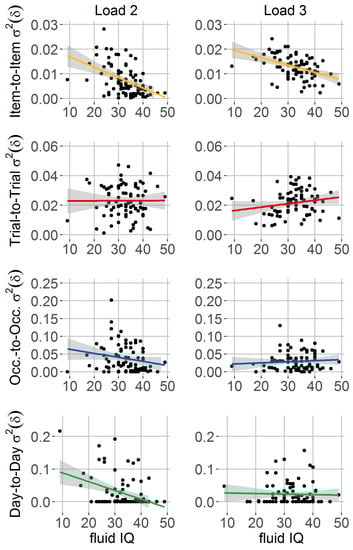 Firstly, we assessed the relationship between fluid intelligence (i.e., CFT-20-R raw scores) and spatial precision components. For mean spatial precision, results demonstrated that children who had on average more spatially precise representations (i.e., lower mean δ) scored also higher in fluid intelligence (Load 2: r = −0.47, p < 0.05, Load 3: r = −0.51, p < 0.05). For the variance components of spatial precision, the item-to-item variability component was significantly related to fluid intelligence scores for both Load 2 (r = −0.47, p < 0.05) and Load 3 conditions (r = −0.44, p < 0.05) (cf. Figure 5, first row). No significant associations were observed for the trial-to-trial (Load 2: r = 0.004, p = 0.97; Load 3: r = 0.19, p = 0.09) and occasion-to-occasion variance component (Load 2: r = −0.2, p = 0.08; Load 3: r = 0.09, p = 0.47). The day-to-day variance component showed a significant relationship for Load 2 (r = −0.37, p < 0.05) but no significant association for Load 3 (r = −0.03, p = 0.78). Thus, children’s fluid intelligence was significantly linked to both mean and variability of spatial precision. Notably, among variance components, variability from item to item showed most consistent associations with fluid intelligence, where lower variability under both loads was linked to higher fluid IQ.
