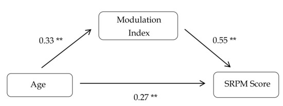 Mediation analysis of the relation between age and SRPM scores mediated by the modulation index. ** p < 0.01.
