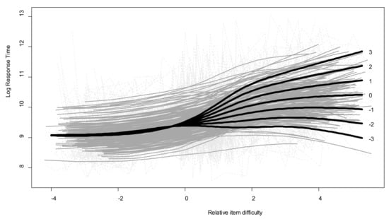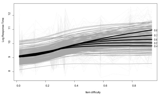 Log.RTs by item difficulty and children’s expected ability for their age, with predicted values illustrating the GAMM results. Light-gray dotted lines: observed values; gray lines: individual fitted values; bold black lines: predicted values for a representative subset of individual relative ability parameters on the Rasch scale ranging from −3 to 3.