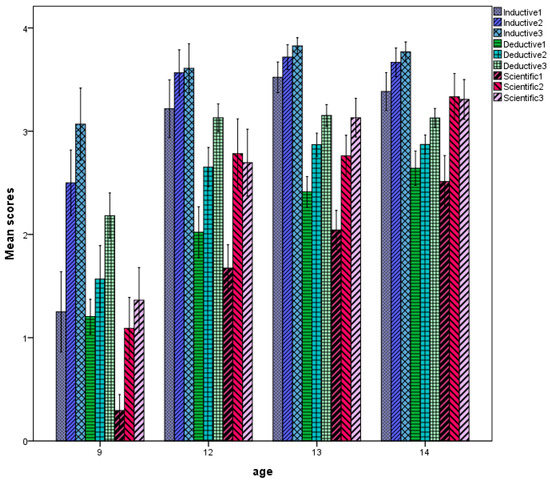 The pattern of performance on the cognitive tests is shown in Figure 1. The effect of age, F (3, 252) = 120.415, p < 0.0001, partial η2 = 0.59, was highly significant and very powerful, reflecting large improvement of performance across age groups. The effect of testing wave was also significant, F (2, 251) = 238.813, p < 0.0001, partial η2 = 0.66, reflecting large improvement across testing waves. The effect of cognitive domain was also highly significant, F (3, 251) = 259.668, p < 0.0001, partial η2 = 0.67, reflecting variation of performance across domains: performance on inductive reasoning was higher than on deductive reasoning and this was higher than scientific reasoning. The interactions between age and wave F (6, 504) = 7.732, p < 0.0001, partial η2 = 0.08, and wave and domain, F (4, 249) = 7.756, p < 0.0001, partial η2 = 0.11, were also significant, indicating two trends: first, the magnitude of improvement across waves varied with age; it was much larger at lower ages, indicating transition from rule- to principle-based thought and approaching ceiling at older ages; the second change was almost linear across domains in inductive and deductive reasoning but larger from first to second than from second to third in scientific reasoning. Noticeably, no effect of gender ever reached significance.