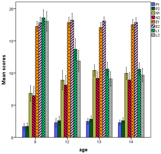 There were similarities and differences in the pattern of relations between age, testing wave, and personality dimensions. Specifically, the effect of age, F (3, 256) = 9.307, p < 0.0001, partial η2 = 0.10; wave, F (1, 256) = 15.390, p < 0.0001, partial η2 = 0.06, and dimension was significant, F (3, 254) = 1811.559, p < 0.0001, partial η2 = 0.96. Additionally, the age by dimension, F (9, 768) = 8.264, p < 0.0001, partial η2 = 0.09, and the waves by dimension interaction was highly significant, F (3, 256) = 28.287, p < 0.0001, partial η2 = 0.26, indicating that the relation with age differed across dimensions. Figure 2 illustrates these effects: P and N increased across the first three age groups and decreased at the last age group; scores in E increased from 9 to 11 years, decreased from 11 to 13, and then increased again; scores in L decreased across the first three age groups and stabilized there. Across waves, P and E increased; N and L decreased. Thus, in line with our first prediction, changes in personality were larger earlier in age, largely reflecting patterns of cognitive change.