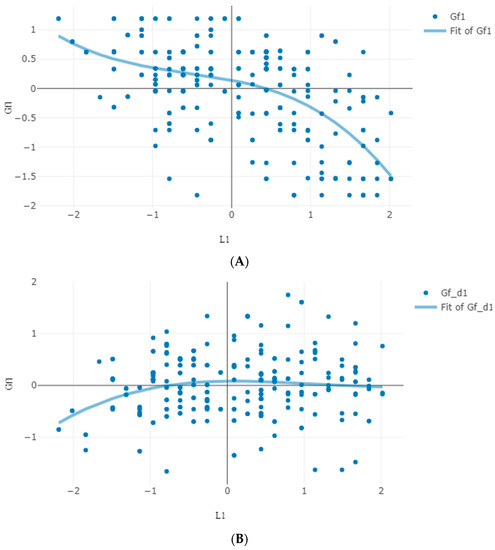 This model accounted well for the patterns of performance observed (Pearson chi-square (15,526) = 2537.66, p = 1.0; likelihood ratio chi-square (15,526) = 773.224, p = 1.0; entropy = 0.88). The probability of moving to a higher level was higher (0.54) than staying to the same level (0.46) (odds to progress was 1.17). Of the various covariates, only L exerted a significant influence on transition (2.33, p < 0.0001; odds = 10.24) (see Study 1, Model 3, in Supplementary Materials). Overall then, in line with the third prediction about cognizance, higher scores in L at the start were associated with transition to a higher cognitive level. It is noted, however, that despite this overall relation, the cubic relation between cognitive attainment and the product of age by social likeability suggests that early in age (from late childhood to adolescence) it is more likely to change when L is lower rather than higher than latter in age (after the age of 12 years). To model this relation, age was included as a covariate in the model, in addition to the personality scores. Indeed, in this model, individuals with higher L scores were 4.28 times more likely (1.46, p < 0.002) to stay at the initial level rather than transition to a higher level as compared to individuals with lower likeability scores. This might imply that at the transition from childhood to adolescence lower likeability scores reflect a stricter and more accurate cognitive self-representation, implying more advanced transition possibilities. Figure 4 illustrates this pattern of relations from first to second testing: Panel A shows the negative relation between Gf and L (R2 = 0.39); panel B shows that higher L scores associated with increases in Gf from first to second testing (expressed as the difference between first and second testing scores) especially at initially lower cognitive ability levels (R2 = 0.07).