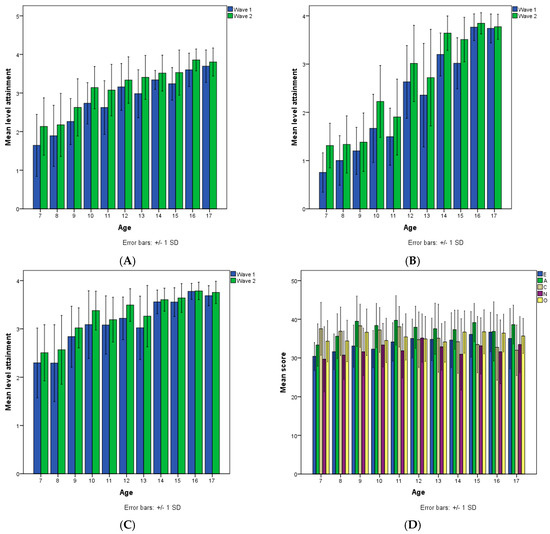 Mean level attainment in arithmetic, algebraic, and Raven reasoning (Panels A–C) and personality (Panel D) as a function of age and testing wave. (A) Arithmetic ability; (B) Algebraic reasoning; (C) Raven; (D) Personality traits.