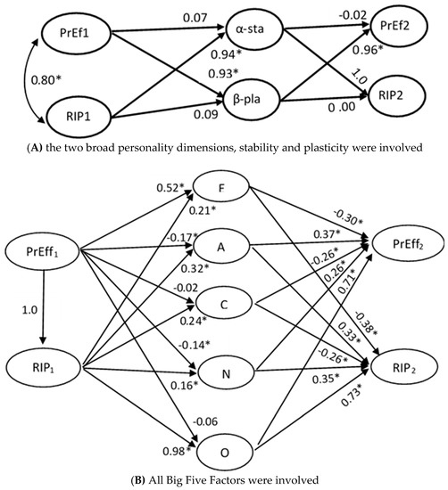 Notably, the fit of the constrained model, χ2 (544) = 1839.87, p > 0.001, RMSEA = 0.074, model AIC = 751.87, was acceptable and better than the fit of the unconstrained model, χ2 (536) = 2060.84, p > 0.001, RMSEA = 0.081, model AIC = 988.84. This is the model shown in Figure 6A. The pattern of relations was very interesting: the α-factor, stability, was very strongly related to RIP (0.94) and very weakly to processing efficiency (0.07); plasticity, the β-factor, demonstrated the inverse pattern of relations: it was weakly related to RIP (0.09) but strongly to processing efficiency (0.93). This pattern of relations was replicated in the effects of personality on cognitive performance at second wave: plasticity influenced processing efficiency (0.96) but not stability (−0.02); stability influenced RIP (1.0). A possible explanation of these very high relations is in order here. Probably, our cognitive tasks, being very carefully scaled developmentally, are sensitive to cognitive variation that is relatively masked in psychometric tests where standardization in reference to individual differences suppresses developmental variation. These relations were further probed in a model where personality factors were individually involved (Figure 6B). In this model, processing efficiency at first testing was significantly related to E (0.52), A (−0.17), and N (−0.14); RIP at first testing was significantly related to all Big Five factors; notably, however, only its relation with O was very high (0.98); the rest were moderate (~0.2–0.3). Interestingly, all Big Five factors related significantly with both cognitive factors at second testing. Again the relations of all but O with each of these two cognitive factors varied circa 0.3; the relation of O with both cognitive factors was very high (~0.7); attention is drawn to the negative relation of C with both second-testing cognitive factors. It is suggested, in agreement with our third prediction, that personality interacts developmentally with cognition at both the level of individual Big Five factors and the level of more general factors representing stability and plasticity, with A and O to be the factors leading these two general personality orientations.