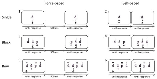 Illustration of the six different conditions of the modified d2, varying stimulus arrangement (single, block, row) and pace (force-paced [with response-stimulus interval] versus self-paced [without response-stimulus interval]). For all of these conditions, the task was to decide whether the relevant stimulus, as indicated by an arrow, was a d2 or not and to press the corresponding key.