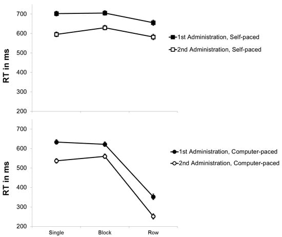 Mean RT (in ms) of the modified d2 as a function of stimulus arrangement (single versus blocks versus rows of stimuli) and pace (self-paced versus force-paced) for the first and second administration. Bars represent standard errors.