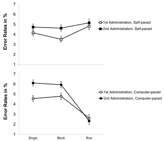 Mean error rates (in%) of the modified d2 as a function of stimulus arrangement (single versus blocks versus rows of stimuli) and pace (self-paced versus force-paced) for the first and second administration. Bars represent standard errors.