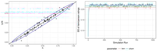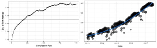 The left panel of Figure 2 shows the problem of rating variance inflation in the ERS simulation. Since all starting values are zero it takes some runs until the system converges. After about 20% of the simulated games, the observed variance crosses the horizontal line indicating the true variance. However, in the remaining runs the variance keeps increasing. This indicates that the scale at which the system operates is not fixed over time. It should be noted that the magnitude of the effect is determined by a lot of factors: For example, the K-factor, the numbers of items and persons in the system and the item selection function. However, in all situations where items are adapted to the ability of players some inflation of rating variance occurs. The right panel of Figure 2 shows a comparable increase in the standard deviation of the item ratings of the subtraction game for every week between January 2013 and September 2017.