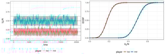 The left panel depict the estimates of two players (one with a low and one with medium true value throughout the simulation, with the grey bars indicating the 95% CI. The right panel shows close correspondence of the cumulative density function based on the estimates (coloured dots) and based on the true values (black line).