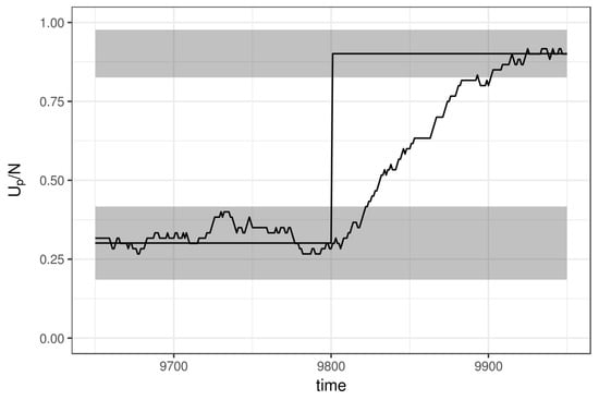 To show that the ratings adapt to the new true state (learning), Figure 5 depicts the ratings () of a simulated player that at iteration 9800 suddenly changed its true ability. The tracker nicely follows this jump and after nine sessions (93 responses) the tracker falls within the 95% CI of the new true value. Note that the speed of convergence to a new state is, other than the size of the jump, solely dependent on the urn size.