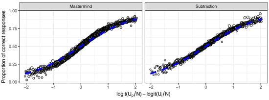 A visualisation of model fit for both analysed games, by comparing observed (black dots) and expected (blue line) probabilities of a correct response for each of the binned differences between the logits of and .