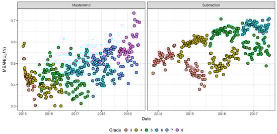 Second, to illustrate learning in the Math Garden system we follow a cohort of children born in 2007. Data are aggregated by week. Only the average scores are included of weeks on which at least 25 different players have played the game. The left panel of Figure 7 shows that when children become older an increase is present the average estimated ability scores in the Deductive Mastermind game. However, also a big variation is present in the scores between different weeks. For the subtraction game, as expected, the average ability rating increased over time (right panel of Figure 7). The lower cluster of dots represent children that lack a year behind the expected grade. A comparison of the two panels highlights the expected difference between the average growth in ability in a scholastic game versus a non-scholastic game. Since children practise subtraction in school, large grade differences are expected and found in the data, whereas for the Mastermind game an increase over time is present that large grade effects are missing.