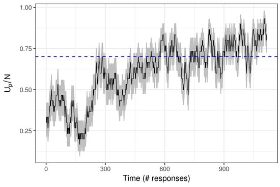 Finally, we analyze the growth of a single player. Figure 8 shows the rating of a player during the 1116 responses (s)he provided. As indicated by the CI, in the first set of about 300 responses the ability of this player grows towards the reference point of . From the 300th response on-wards, the rating first declines and then fluctuates around (as indicated by the CI). Towards the end of this times series, the rating indicates that this player outperform the reference point. The rating corresponds to item ratings of item such as 26–19, 42–23, and 50–33.