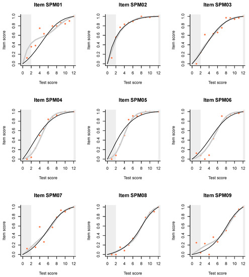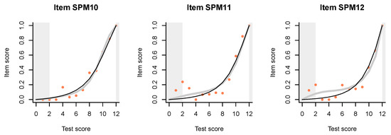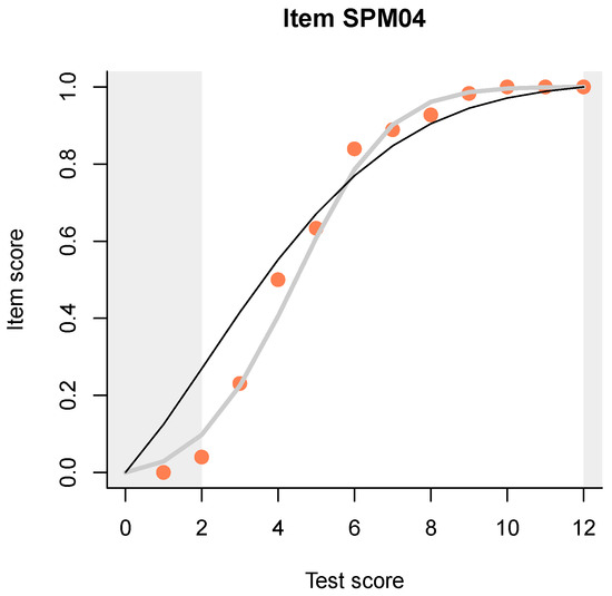 The plot for item SPM01 is very different. The IM curve has a very particular and irregular shape, thanks to which it deviates sharply from the Rasch model in the lower ability range, but much less in the upper range. What is going on among persons of lower ability? Are they guessing? The pseudo-guessing parameter in the 3PL model (Appendix B) is equal to zero for both items, and what is the logic to guess when the item is so easy? Why on the first item but not on the second?