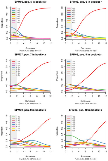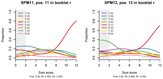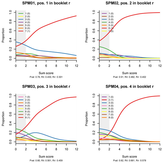 Similar, but milder effects are observed on the ITR for items SPM09, SPM12, and possibly SPM11. The 3PL model (Appendix B) has larger pseudo-guessing parameters for these items. The distractor plots (Figure 4) show that all distractors are in use, but some of them tend to peak out in the middle, a bit like the middle category in a partial credit item. There might be some reason for this in the way Raven items are constructed.