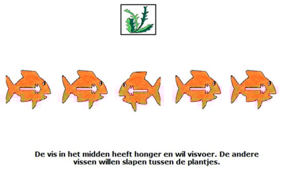 An example of a shifting trial during the Fish Game. Translation of text in the figure: “The fish in the middle is still hungry and wants fish food. The other fishes want to go to sleep between the plants.”