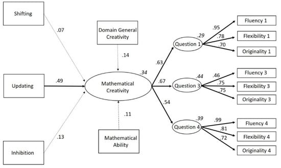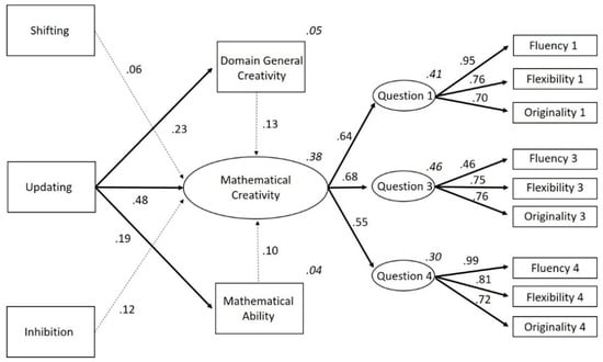 Next, we tested Model 2, with direct associations between updating on the one hand and mathematical ability, domain-general creativity and mathematical creativity on the other (as originally depicted in Figure 2). This model had 59 estimated parameters which met the fit requirements (CFI = 0.990, TLI = 0.985, χ2 = 72.64, df = 60, χ2/df = 1.21, p = 0.13, RMSEA = 0.028 (90% CI: 0.000–0.047), SRMR = 0.043). For a full visual representation of the results, see Figure 6 This model revealed a positive influence of updating on mathematical ability and mathematical creativity. Furthermore, shifting, updating, inhibition, mathematical ability, and domain-general creativity also positively influenced mathematical creativity. The effects of inhibition (Standard Error = 0.000; Critical Ratio = −1.564; p = 0.118), shifting (Standard Error = 0.000; Critical Ratio = −0.878; p = 0.380), mathematical ability (Standard Error = 0.061; Critical Ratio = 1.476; p = 0.140), and domain-general creativity (Standard Error = 0.006; Critical Ratio = 1.887; p = 0.0.59) on mathematical creativity were not statistically significant. All other paths were statistically significant (see Figure 6 and Table 2). Thus, although the total mediation effect of updating on mathematical creativity through mathematical ability or domain-general creativity was not significant, we can still conclude partial mediation is present (MacKinnon et al. 2002; Shrout and Bolger 2002; Zhao et al. 2010).