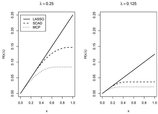 Different penalty functions used in regularization with regularization parameter (left panel) and (right panel).