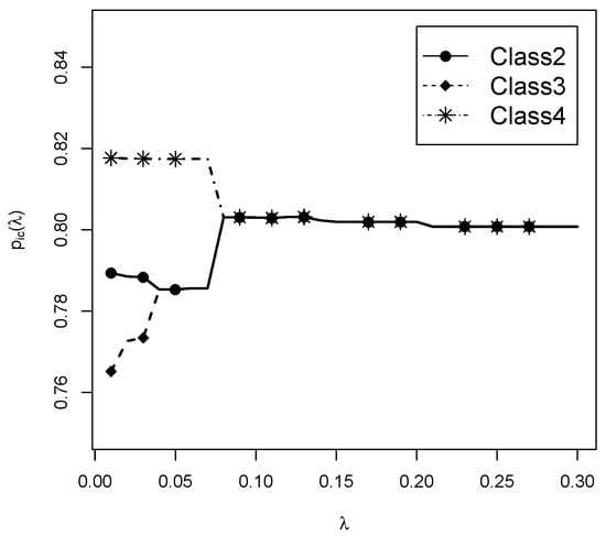 Lastly, we want to illustrate the behavior of regularization. For the sequence of specified regularization parameters in the estimation, the estimated item response probabilities can be plotted. Such a plot is also referred to as a regularization path (Hastie et al. 2015). With very small values, no classes were merged, and all item parameters were estimated differently from each other. With increasing values of , item parameters were subsequently merged. For Item 1 and Classes 2, 3, and 4, the regularization path is shown in Figure 3. At first, item parameters of Class 2 and 4 are merged at . Afterwards, all three item response probabilities are merged at .