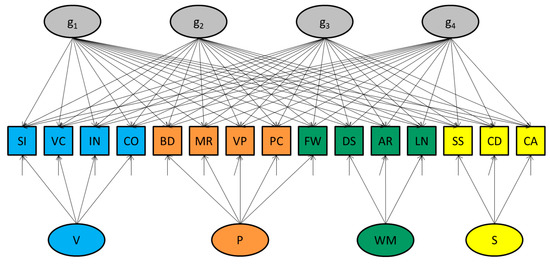 Graphical representation of the (nonidentified) penta-factor model. Note: abbreviations of subtests: SI—Similarities; VC—Vocabulary; IN—Information; CO—Comprehension; BD—Block Design; MR—Matrix Reasoning; VP—Visual Puzzles; FW—Figure Weights; PC—Picture Completion; DS—Digit Span; AR—Arithmetic; LN—Letter–Number Sequencing; SS—Symbol Search; CD—Coding; CA—Cancelation. Abbreviations of latent variables: V—Verbal factor; P—Perceptual factor; WM—Working Memory factor; S—Speed factor; g1 to g4—general factors.