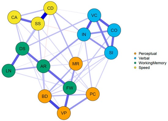 Graphical representation of the confirmatory WAIS network model. Note: abbreviations of Verbal subtests: SI—Similarities; VC—Vocabulary; IN—Information; CO—Comprehension; Perceptual subtests: BD—Block Design; MR—Matrix Reasoning; VP—Visual Puzzles; PC—Picture Completion; Working Memory subtests: DS—Digit Span; AR—Arithmetic; LN—Letter–Number Sequencing; FW—Figure Weights; and Speed subtests: SS—Symbol Search; CD—Coding; CA—Cancelation.
