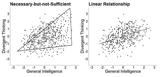 Guilford was one of the first to describe and investigate the relationship between creativity and intelligence. In his initial publication, he stated that “high IQ is not a sufficient condition for high DP [divergent production] ability; it is almost a necessary condition” (). Thus, Guilford assumed that highly intelligent individuals are not necessarily creative but can be creative, while less intelligent individuals are necessarily less creative (), which became an assumption known as the necessary but not sufficient condition. This relationship is schematically depicted in the left plot in Figure 1. If Guilford’s assumption holds and intelligence is a necessary but not sufficient condition for being creative, individuals’ scores scatter within the triangle. Although the original wording of Guilford’s theory was quite unambiguous, comparatively little research was done to test this assumption. Only recently, researchers picked up on the necessary but not sufficient condition (e.g., ; ). In contrast to the necessary but not sufficient condition, one can see that the necessary (and sufficient) condition corresponds to an ordinary linear regression (see Figure 1, middle plot).