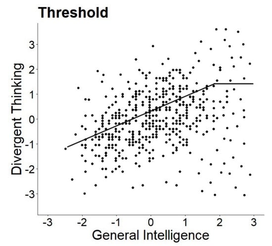 While the inference drawn from our results is unambiguous, previous research on the existence of a threshold of creativity and intelligence is not. A narrative review might infer that the results are mixed with some evidence against a threshold (e.g., ; ), and some evidence in favor of a threshold (e.g., ; ). What are potential causes for these inconclusive results? As we saw in the literature review, some differences were caused by the choice of specific analytical approaches, yet the problem goes deeper. Maybe the most apparent is that the threshold is not set a priori. Short of a convincing theory, these cutoffs are arbitrary and leave ample room for many researchers’ degrees of freedom in the data analysis. This problem is exacerbated by different handlings of outliers, the choice of analytical tools, etc. (). Declaring a threshold presupposes its existence and a specific number suggests a precision rarely found in behavioral sciences. As such, it neglects its positivistic identification. Thresholds suggest a qualitative difference of humans below and above the value that is implausible with respect to creativity and intelligence in specific but also, more generally, for psychological dispositions. Even more nuanced approaches—such as the conditional threshold theory (), that supposes that openness plays a critical role in the intelligence-creativity threshold—are adding further complexity and researcher’s degrees of freedom. There are additional shortcomings of the prevalent data analytical strategy, such as violated model assumptions (e.g., normally distributed and homoscedastic residuals; ). In sum, these statistical issues discussed presumably lead to inconsistent results, which have been reported in the literature.