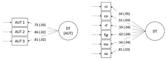 Measurement models for divergent thinking. Study 1 (left model), Study 2 (right model) including standardized loadings and standard errors. Study 1: AUT are single items of the alternate uses task. Study 2: indicators are test-scores. Fluency test-scores are as follows: sa (similar attributes), in (inventing names), ff (figural fluency), and rf (retrieval fluency). Co (combining objects) and ni (nicknames) are originality indicators that were only instructed and scored for originality.