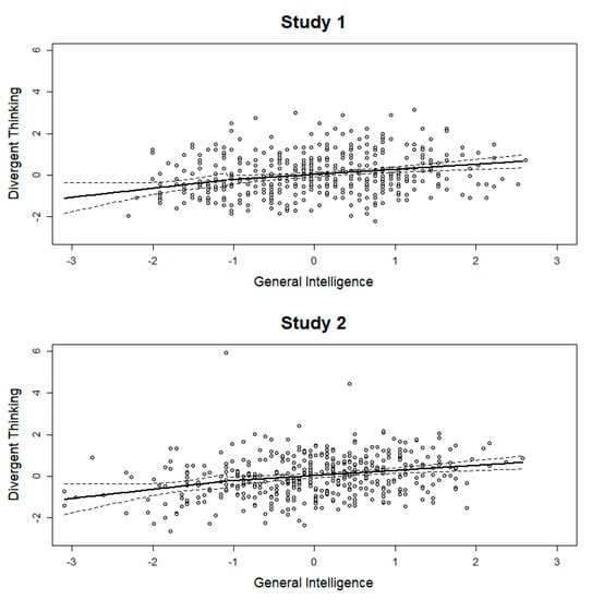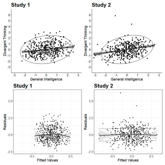 Scatterplots and testing for heteroscedasticity were ur first means to investigate the datasets and to skim for breakpoints in the relation between creativity and intelligence (see Figure 3). In Study 1, the correlation between creativity and intelligence was lower (r = 0.19, p < 0.01) than in Study 2 (r = 0.27, p < 0.01). At first glance, the scatterplots (Figure 3, upper part) showed no sign of a threshold. The heteroscedasticity plots (Figure 3, lower part) showed flat lines based on the loess smoothing function, which indicated evenly distributed residuals across the fitted values. Additionally, the Breusch–Pagan test for heteroscedasticity was not significant in both studies (Study 1: BP(1) = 0.64, p = 0.42; Study 2: BP(1) = 1.16, p = 0.28), so that homoscedasticity could be assumed. The scatterplot and heteroscedasticity plot based on the originality scores (Study 1) are presented in the supplementary material (Figure S2). The Breusch–Pagan test was not significant for originality (BP(1) = 0.47, p = 0.49).