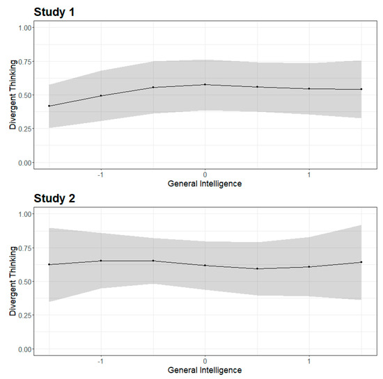 The following are available online at https://www.mdpi.com/2079-3200/8/4/38/s1, Table S1: Descriptive Statistics for all Indicators, Figure S1: Correlations and Bivariate Scatterplots between Manifest Scores, Figure S2: Scatterplot and Heteroscedasticity Plot in Study 1: Originality, Figure S3: Segmented Regression Analysis in Study 1: Originality, Figure S4: Factor Variances at each Focal Point along the Intelligence Continuum in Study 1: Originality, Figure S5: Loadings at the Focal Points in Dataset 1, Figure S6: Loadings at the Focal Points in Dataset 2.
