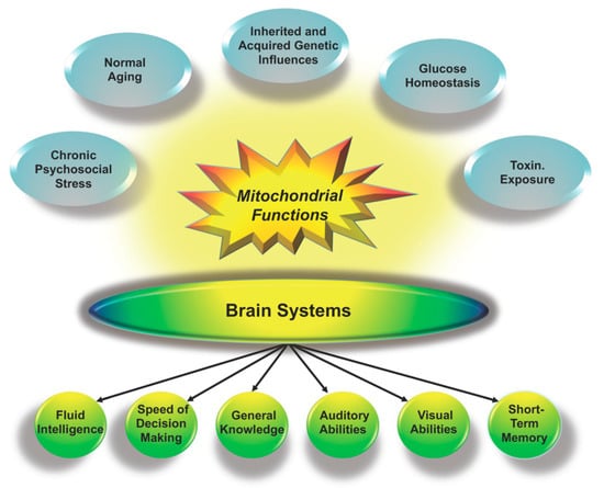 Mitochondrial health contributes to the functioning of brain systems at all levels from individual neurons to large-scale brain networks that support cognitive abilities. Mitochondrial health in turn is influenced by myriad factors, as illustrated by the surrounding ovals.