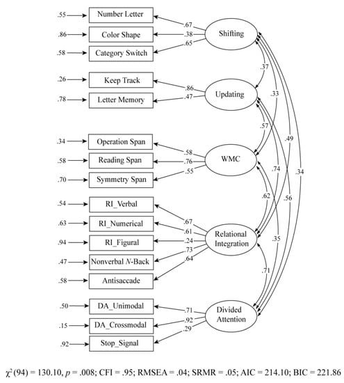 From a theoretical as well as an empirical point of view, using exploratory factor analysis, Himi et al. indicated a five-factor structure of EF (see supplementary analysis in Himi et al. 2019): updating, shifting, inhibition, WMC, relational integration, and divided attention. Unlike Friedman et al. (2016), their EF model did not show a three-factor structure. Rather, the loadings were distributed amongst the five extracted factors. The shifting tasks alone loaded on a separate factor, whereas inhibition and updating tasks were distributed onto different latent factors. Based on these extracted factors, we tested a five-factor EF model using a confirmatory factor analysis with correlated latent variables. Figure 1 represents the applied measurement model. The fit of the model was adequate, χ2(94) = 130.10, p = .008; CFI = .95; RMSEA = .04; SRMR = .05, AIC = 214.10; BIC = 221.86. All path coefficients from the indicators to the corresponding latent variables in this model were moderate to high (shifting: λ = .38 to λ = .67; updating: λ = .47 to λ = .86; WMC: λ = .55 to λ = .76; relational integration: λ = .24 to λ = .73; divided attention: λ = .29 to λ = .92), and were all significant (all p < .01). Correlations between the latent variables were also moderate to high (ranging from r = .37 to r = .74). The shifting factor shared the lowest variance with the other constructs, whereas relational integration and updating shared 55% of the variance.