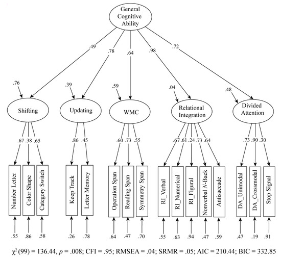 Hierarchical model of cognitive latent variables. The proportion of residual variance of each indicator was calculated by subtracting the variance of the indicator from 1. All parameters were statistically significant (p < .05). WMC = working memory capacity; RI = relational integration; DA = divided attention.