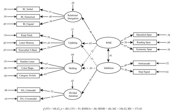 Two-layer six-factor model. The proportion of residual variance of each indicator was calculated by subtracting the variance of the indicator from 1. Not significant (p < .05) paths are indicated as the dotted line. WMC = working memory capacity; RI = relational integration; DA = divided attention.