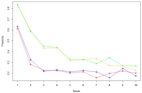 Again, when comparing Model 4 and Model 1, we see a large effect of instruction on flexibility, while load did not significantly enhance the model fit (see Table 3). Furthermore, for flexibility, only the interaction-term for time and instruction (Model 5) further improved model fit beyond Model 4 (see Table 3). In Figure 2, this effect is apparent as a steeper decreasing slope at earlier time intervals of the relative frequency for a response out of an unused category for the be-fluent (red and blue graphs) vs. be-creative instructions (orange and green graphs). Model 5 was also clearly the best fitting model with respect to all examined criteria (see Table 3).