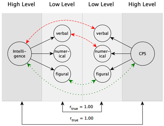 For the sake of simplicity, let us assume that the two constructs intelligence and CPS are perfectly correlated (i.e., rtrue = 1.00). Accordingly, the observed correlation will be highest if the operationalizations are at the same aggregation level and have similar requirements regarding the contents (green/dotted lines in Figure 1). In this case, a symmetrical (fair) comparison of the two constructs is conducted, and—regardless of whether this comparison is conducted on a high or low level of aggregation—the observed correlation is an unbiased representation of the true correlation between intelligence and CPS. However, if operationalizations at different aggregation levels (upper red/dashed line in Figure 1) or operationalizations at the same aggregation level but with different content requirements (lower red/dashed line in Figure 1) are used, an asymmetrical (unfair) comparison is conducted. In this case, the observed correlation will be attenuated. As summarized by Kretzschmar et al. (2018), this effect is mainly caused by different construct representations (i.e., whether the operationalization covers the constructs in its entire breadth or only partial aspects of it) and different reliabilities of aggregation levels (i.e., aggregation usually leads to higher reliability, which sets the boundary to validity estimations; see Wittmann 1988).