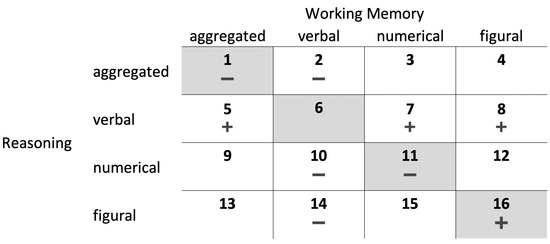 Conditions numbered from 1 to 16 as combinations of different aggregation levels and contents of the operationalizations investigated in the present study (each condition with two models; see Figure 3). Gray-shaded conditions were examined in Zech et al.’s (2017) study and represent symmetrical (fair) combinations in terms of the predictor-predictor symmetry as similar operationalizations of working memory and fluid reasoning were considered. The other conditions can be considered as potentially asymmetrical (unfair) in terms of the predictor-predictor symmetry as different aggregation levels or contents were considered. Ad-hoc expectations whether working memory incrementally explains variance above and beyond fluid reasoning (+) or not (−) are displayed for each condition.